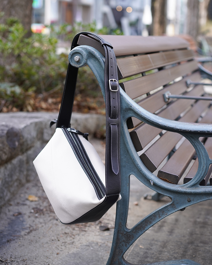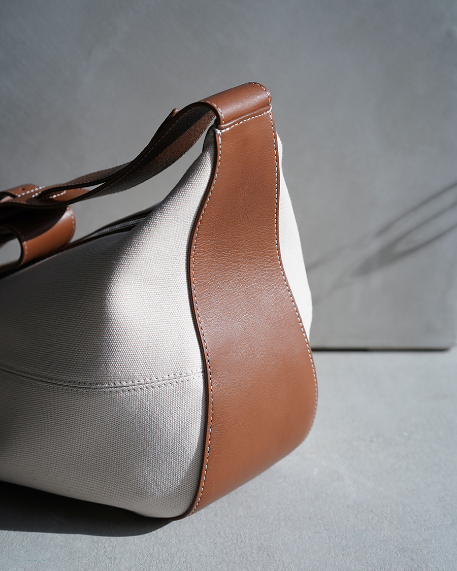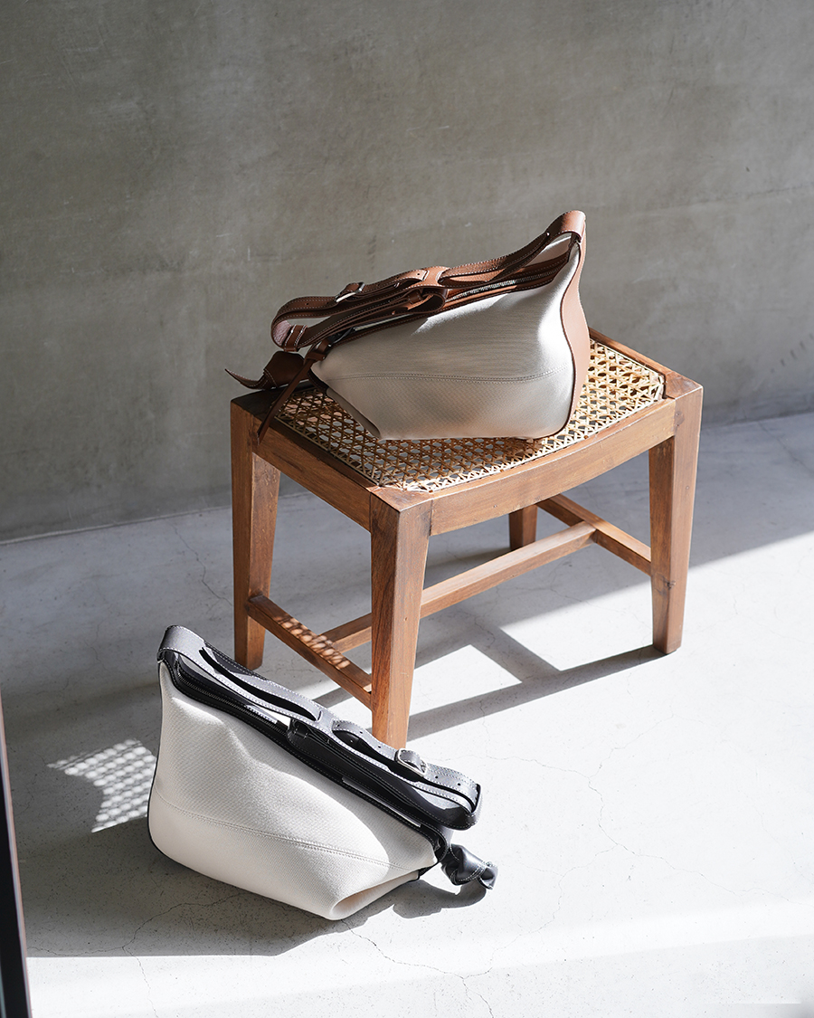 素材は柔らかいイタリア製のカウレザーとリサイクルコットンを使用したキャンバス生地。