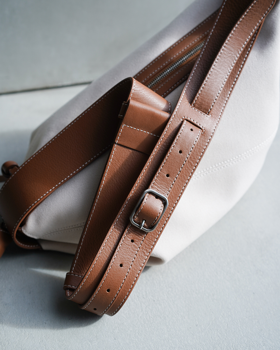 ハードなイメージのレザーとソフトな印象のキャンバス生地の正反対の組み合わせがこなれ感のあるバック。