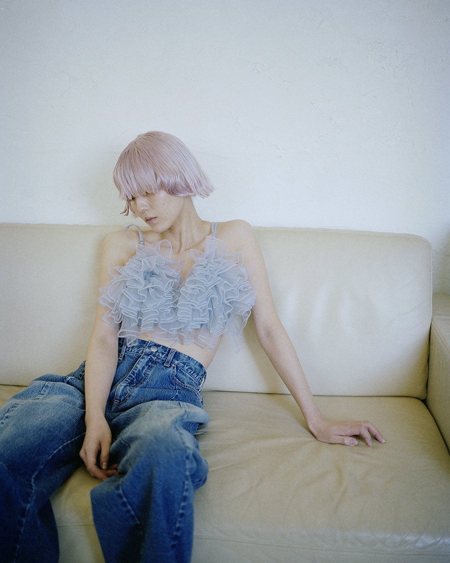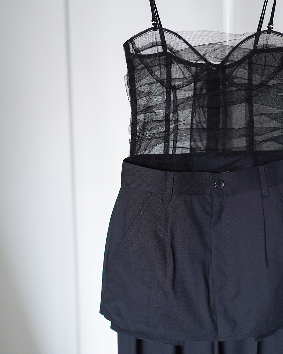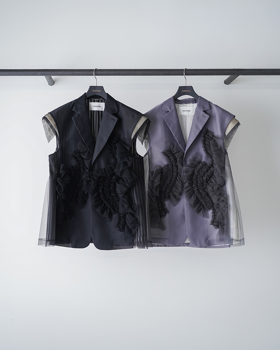 ブランドのアイコンアイテムでもあるノースリーブジャケットに今季は贅沢にチュールがあしらわれて登場。