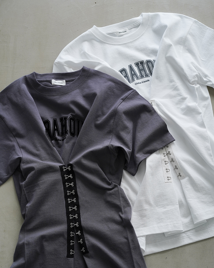 Tシャツって平面的なアイテムですが、ホックで寄せてドレープ感が生まれ立体的で動きのあるデザインに。