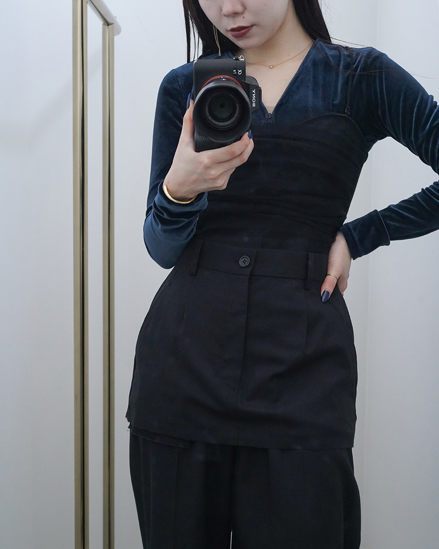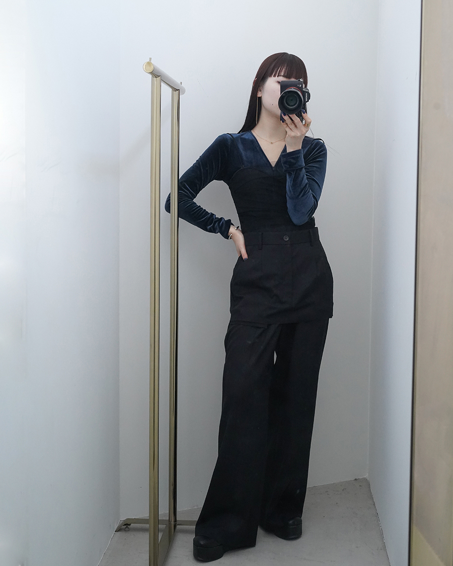 トップス部分はピタッと体に沿うデザインで、パンツはワイドで少しワークテイストなデザイン。
