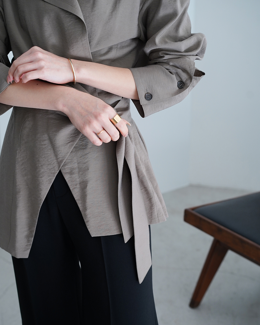 一見、ベーシックなシャツかと思いますがウエストに施されたタイのディテールの存在感が目を惹きます。