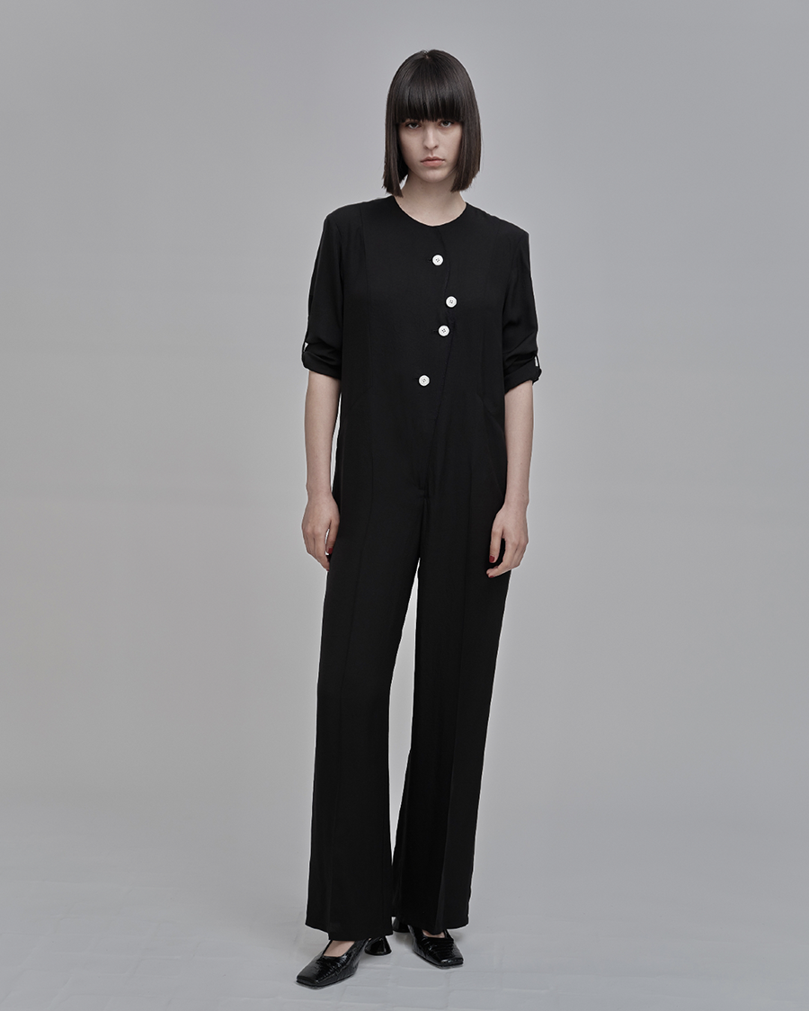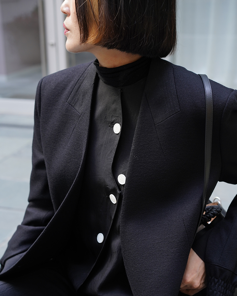 潔く無駄のないシルエットに、白いボタンが流れるように配されたカッティング。