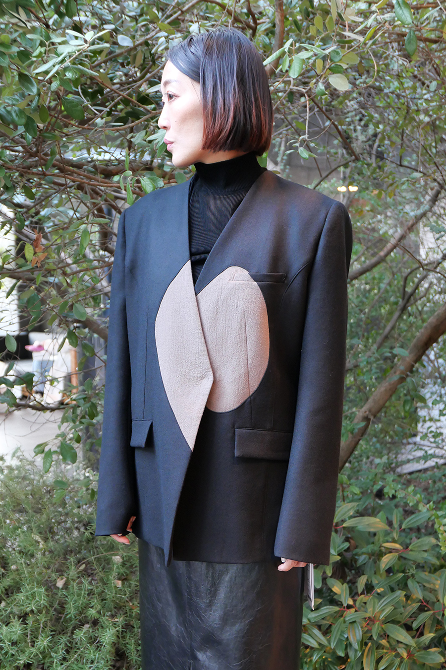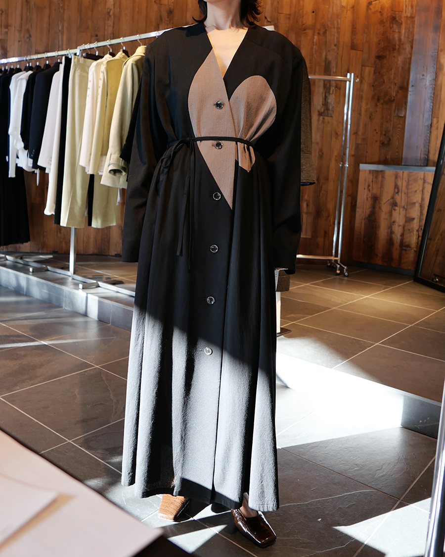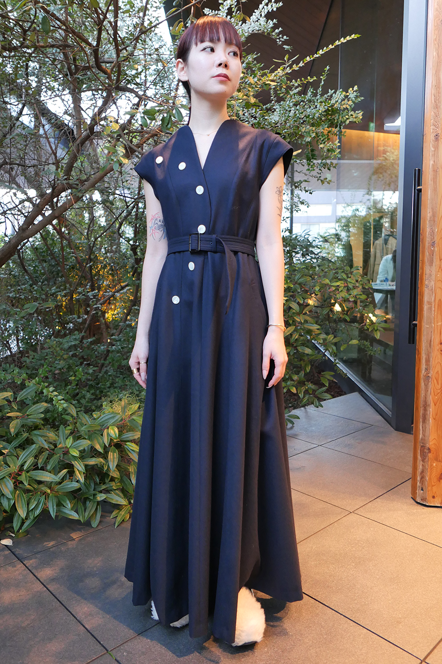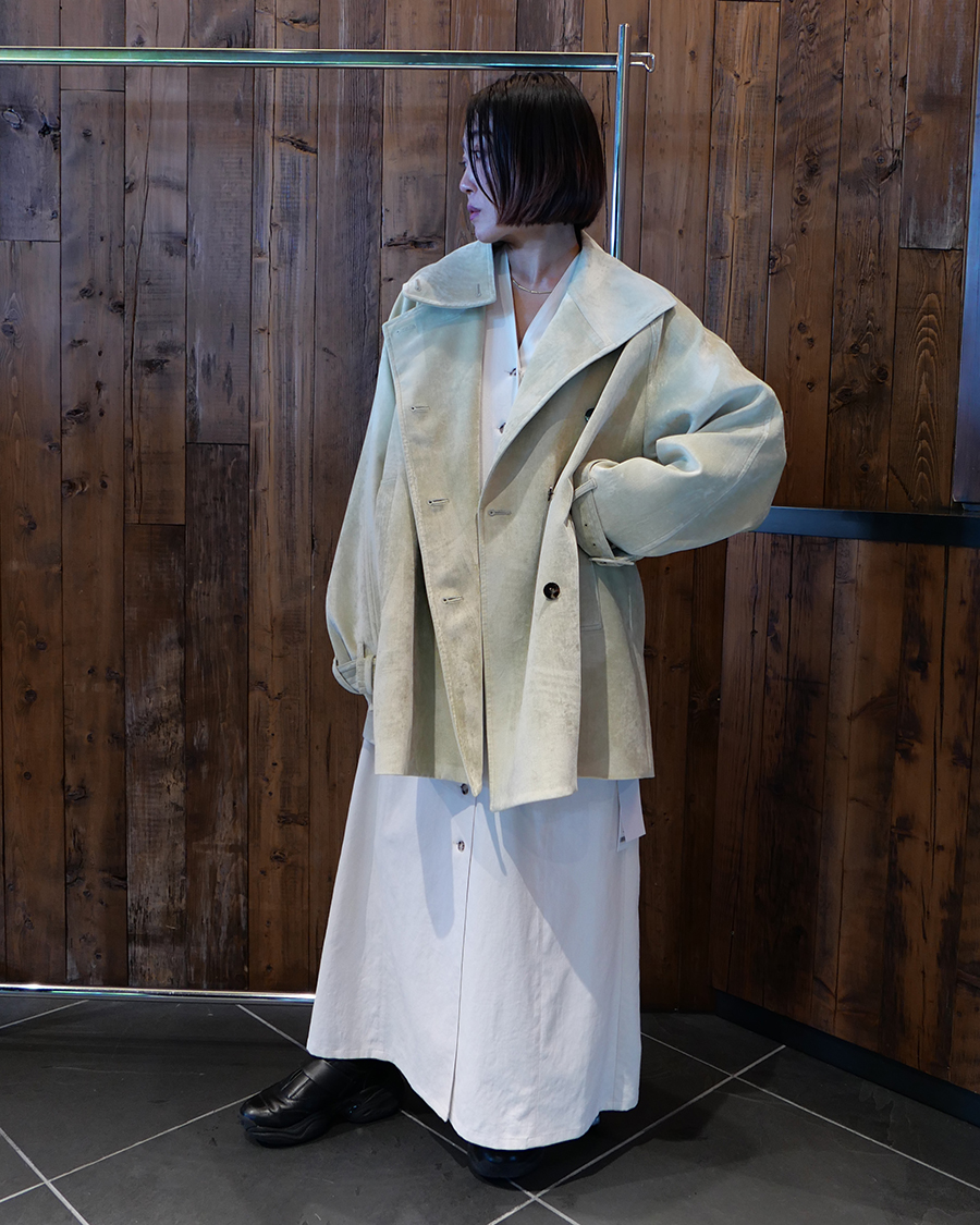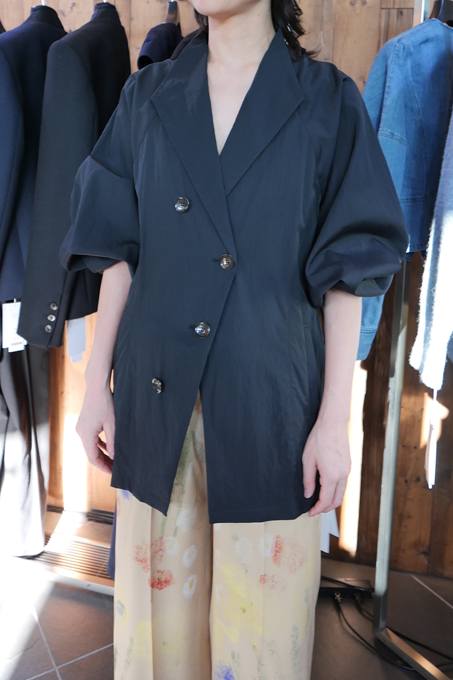 ボタンの配置や襟のデザインでモードに、エレガンスに見せながら、バックスタイルのドローコードや袖のボリュームでカジュアルな要素も加えられています。