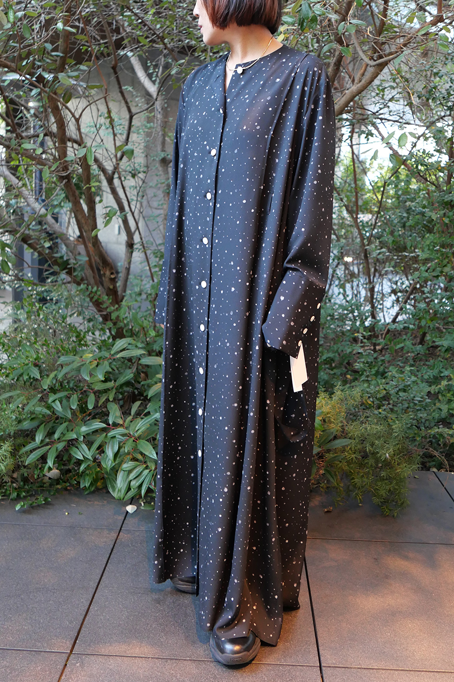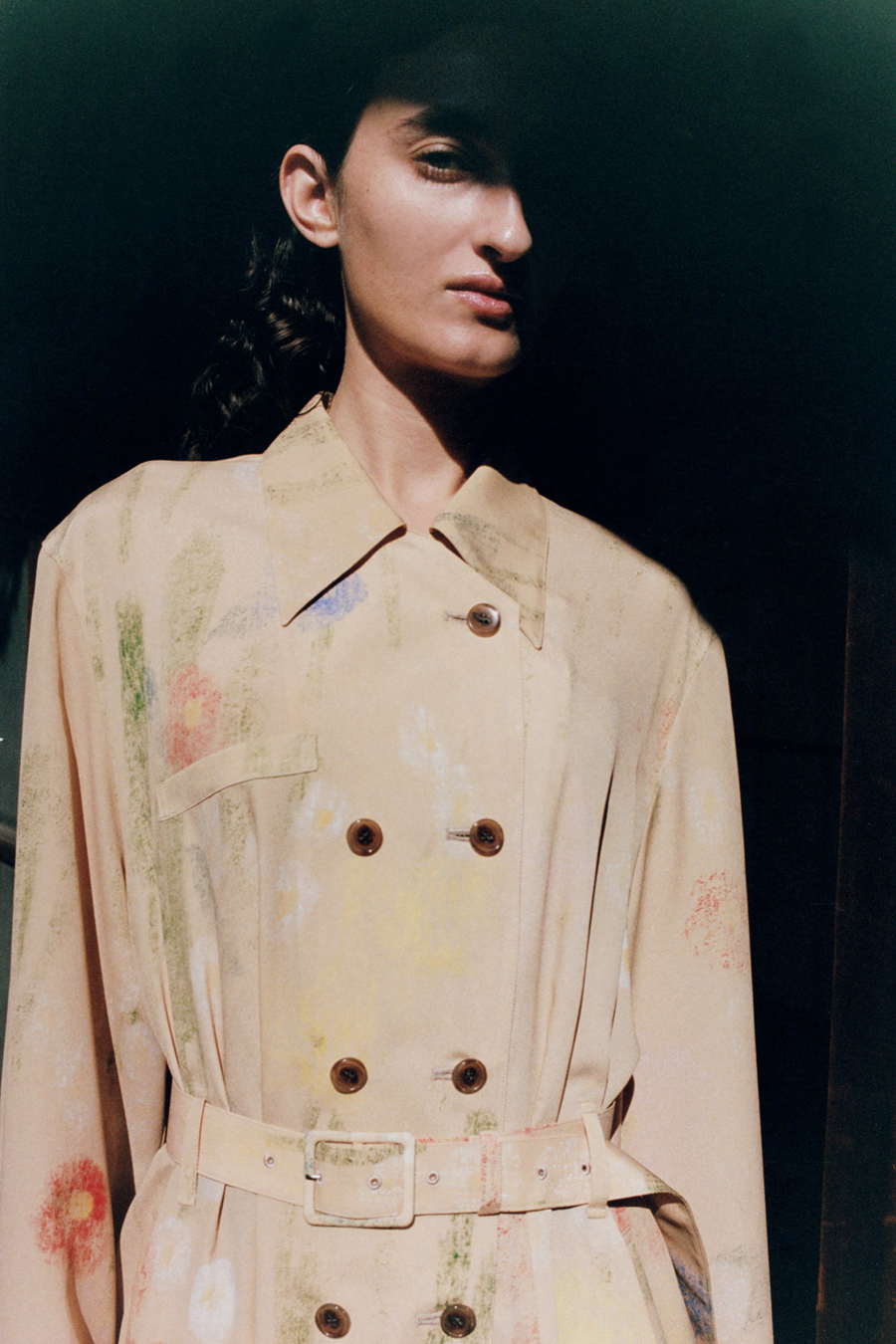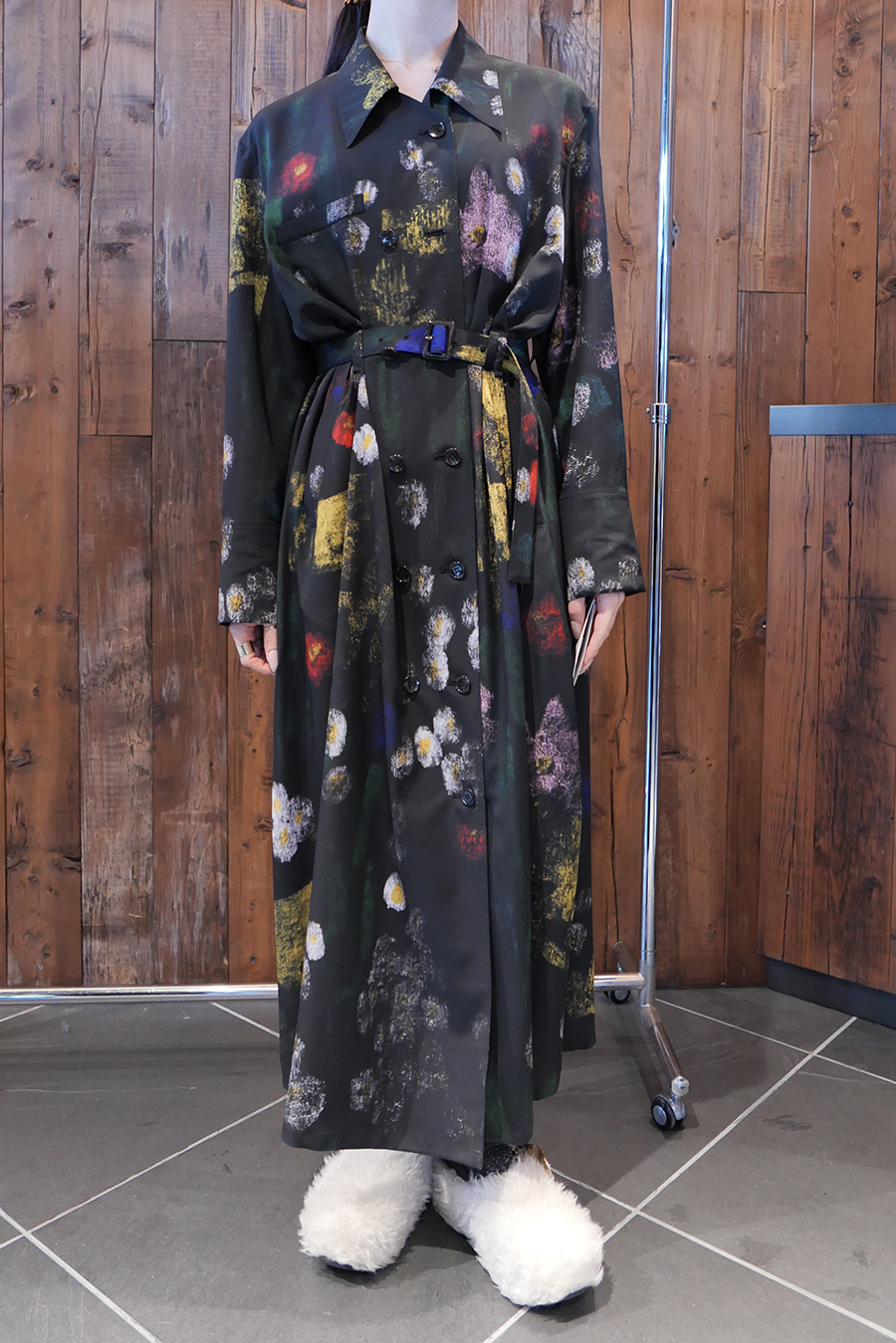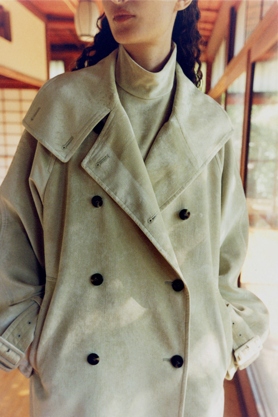 ボタンの配置や襟のデザインでモードに、エレガンスに見せながら、バックスタイルのドローコードや袖のボリュームでカジュアルな要素も加えられています。