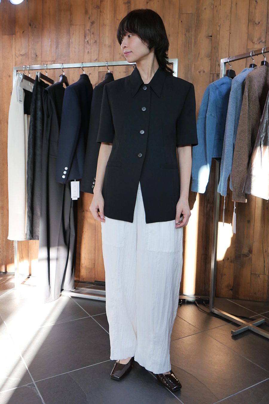 ボックスシルエットのノーカラージャケット、今季はタイ付きでのリリース。