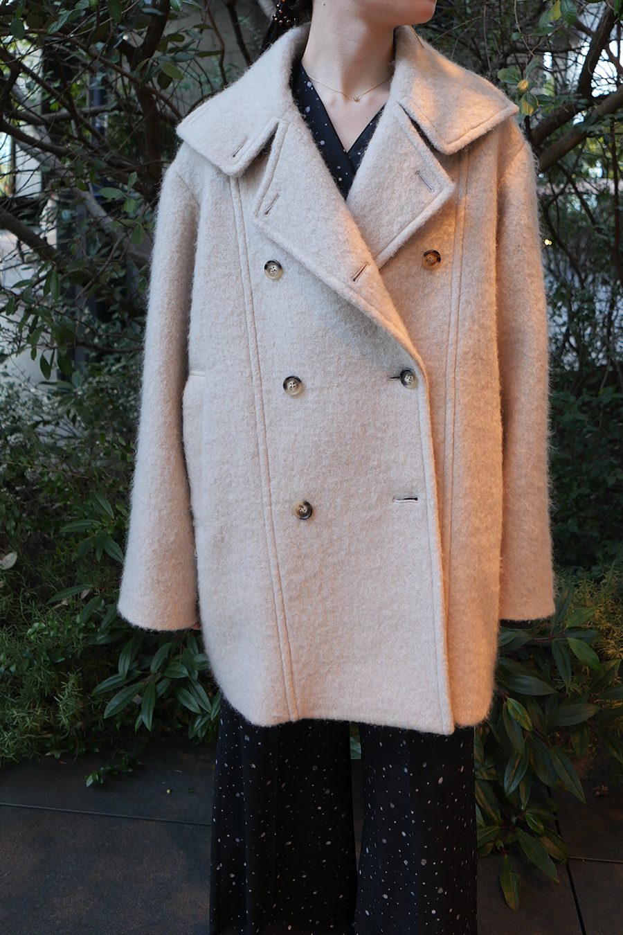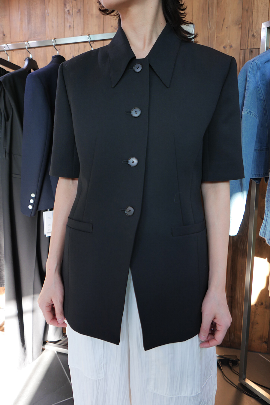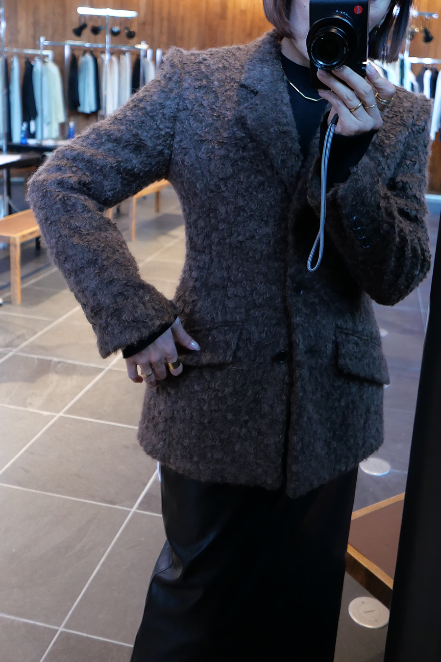 テクスチャーのある素材で肩にクラシックな袖付けを施し、腰の丸みに沿ったシルエット。