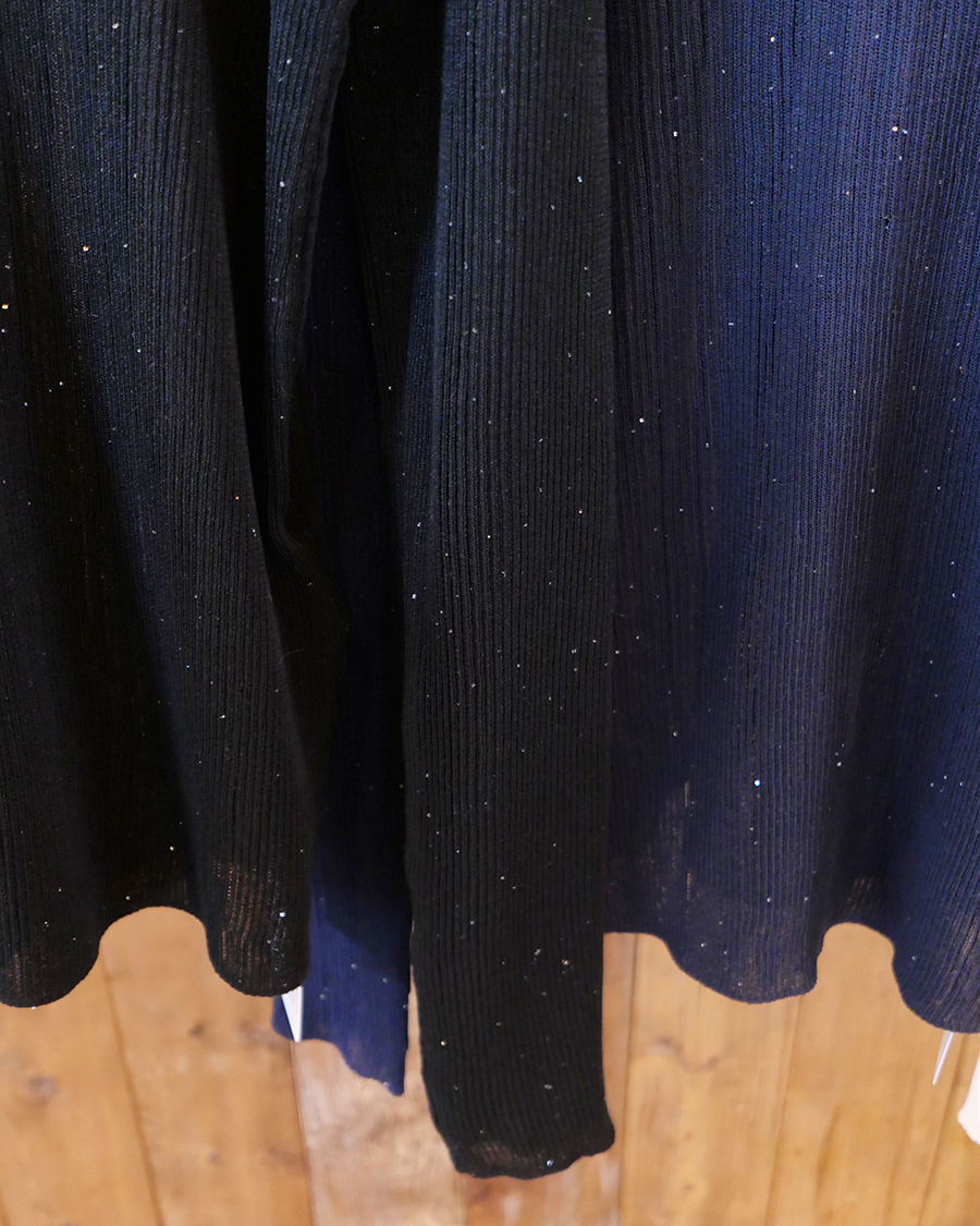 とても小さなスパンコールが配置されたキラキラとしたリブシアートップス。