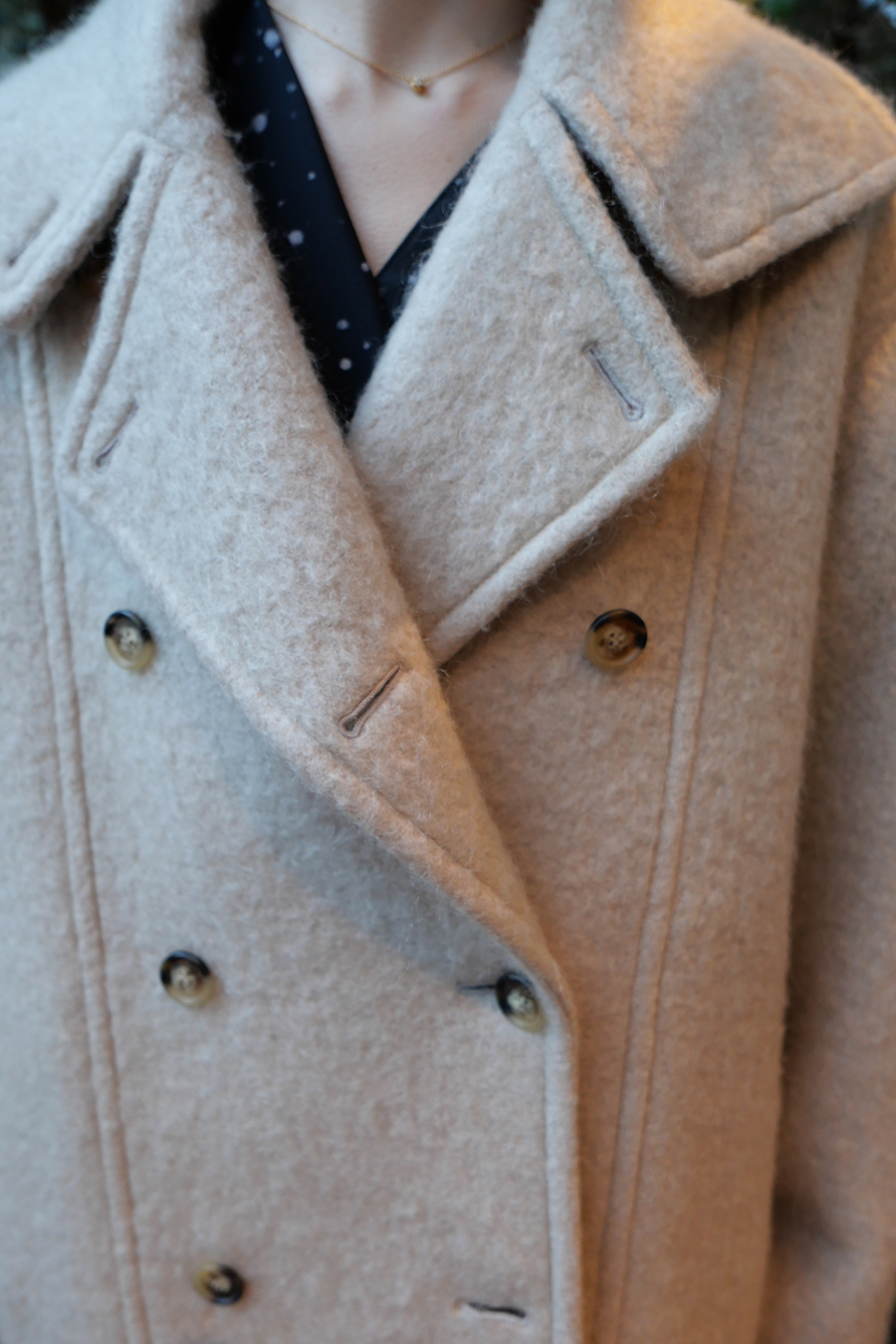 こちら、着用した様が非常にハンサム。ダブルの見返しに肩まで覆われるビック襟が特徴です。