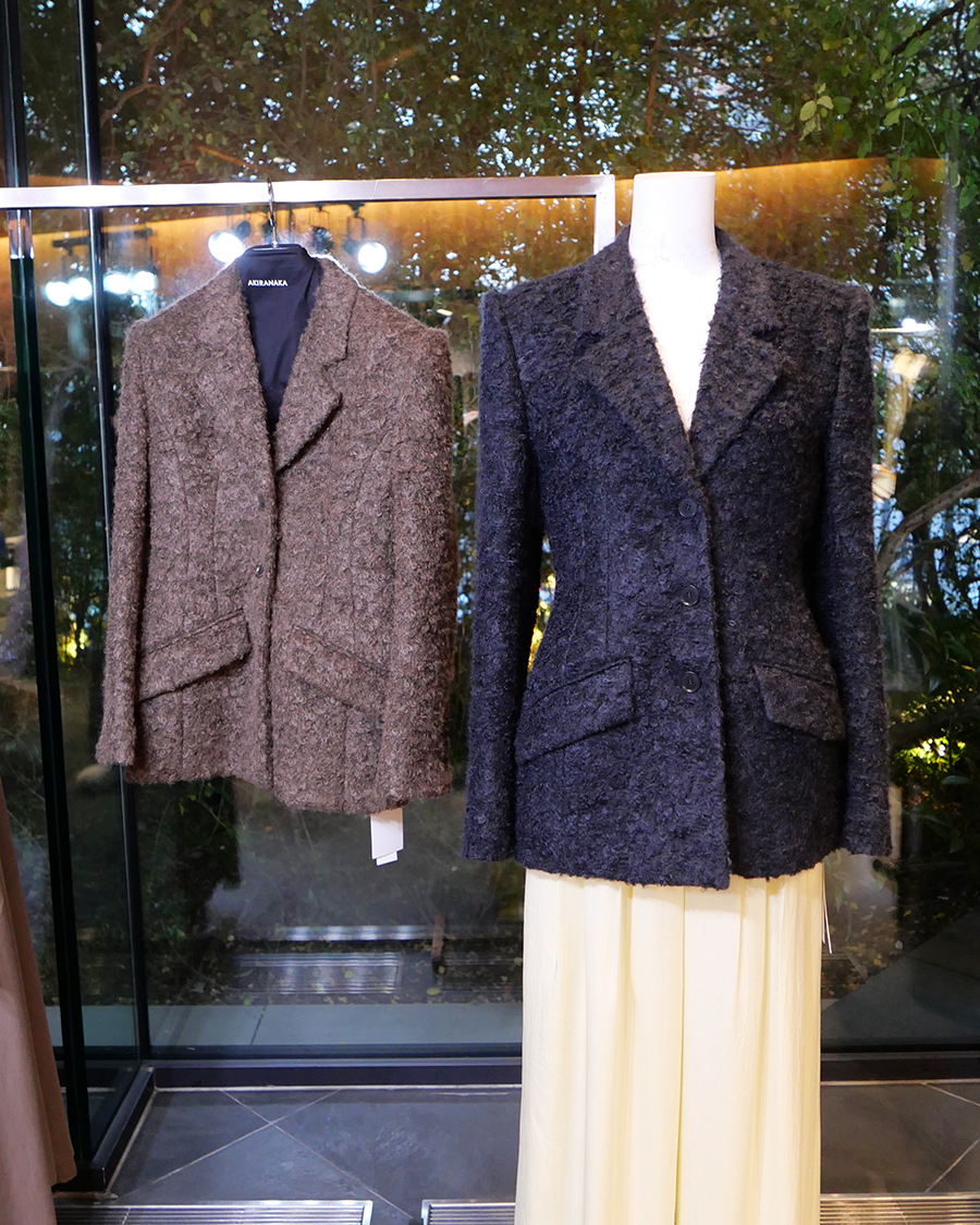 岩手のテーラーリング屋さんにデザインチームで行って、袖山布の雪山を何枚も入れて試行錯誤したループヤーンのジャケット。