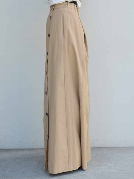 フロントの縦に綺麗に並んだボタンが縦長効果をだしスッキリとした印象を与えてくれます。フルボトムでフレアですが軽い着心地。