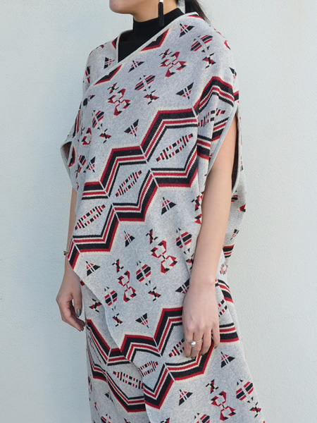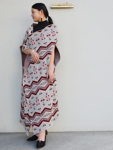 大判ストールを体に巻きつけたようなルーズなポンチョ。サイドについたボタンで調整が可能。
