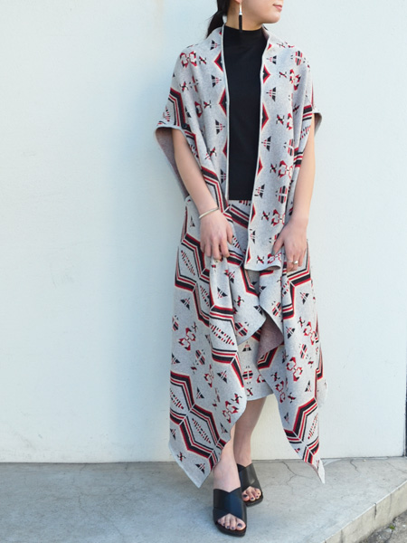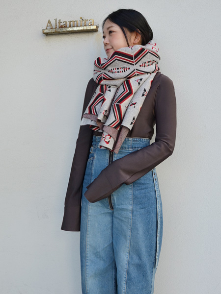 トライアングル柄ストール、ニットスカート。