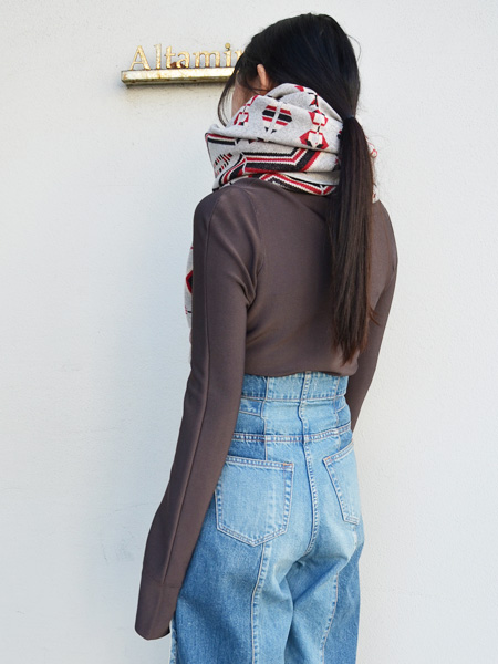 ボタンを外し紐状に伸ばして、首元にぐるぐると巻くとストールに。