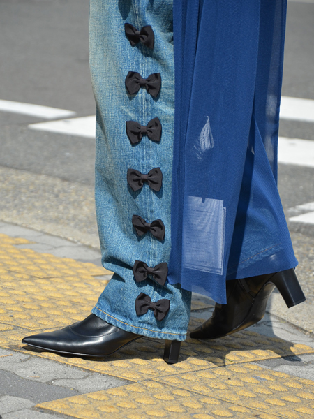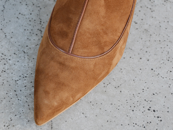 パンツと合わせて つま先をチョコンと出すのもポインテッドだからこそ可愛いスタイリング。