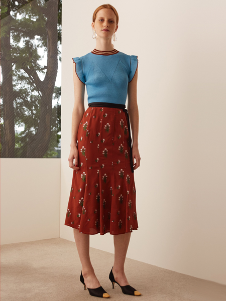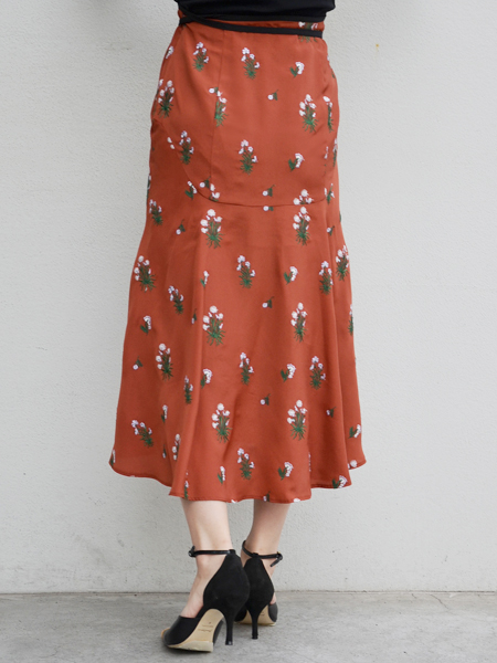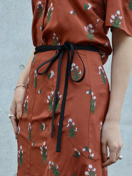 テラコッタのカラーに浮かび上がるノスタルジックな小花柄の刺繍は、
