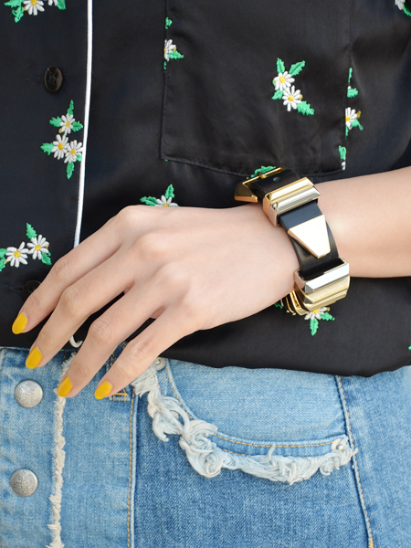 スタッズやゴールド、シルバー、真鍮とボリュームのあるバーはどんなアクセサリーとも相性が良いのも魅力。