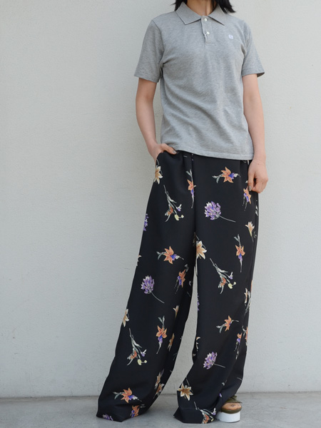 クラシカルでモードな花柄パンツに、ソフトなグレーのポロシャツ。