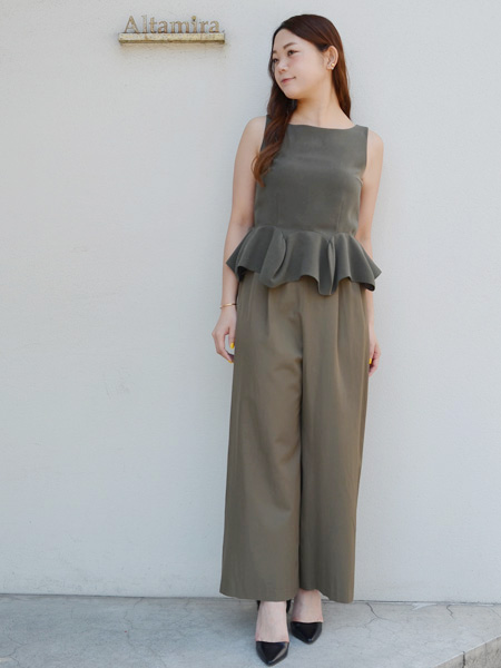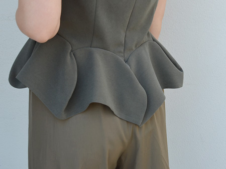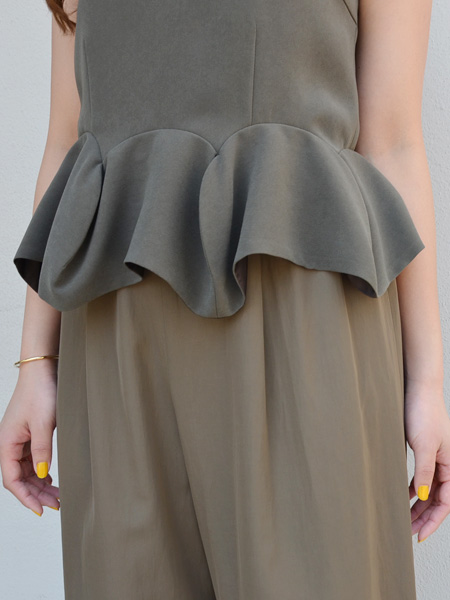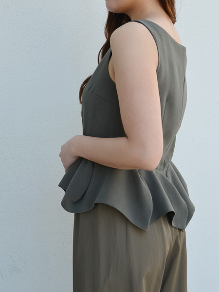 伸縮性のあるストレッチ素材で裾の揺れるペプラムのデザインが印象的なノースリーブ。