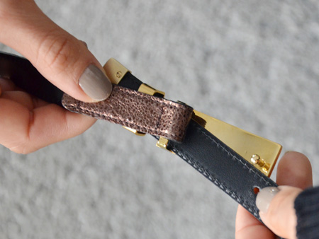 真鍮の裏にベルトの端っこを通して、お好みの長さで真鍮側についているポールにベルトホールを差し込むだけ。