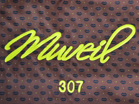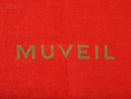 筆記体で大きく入ったMUVEILのロゴは刺繍で立体的に描かれています。