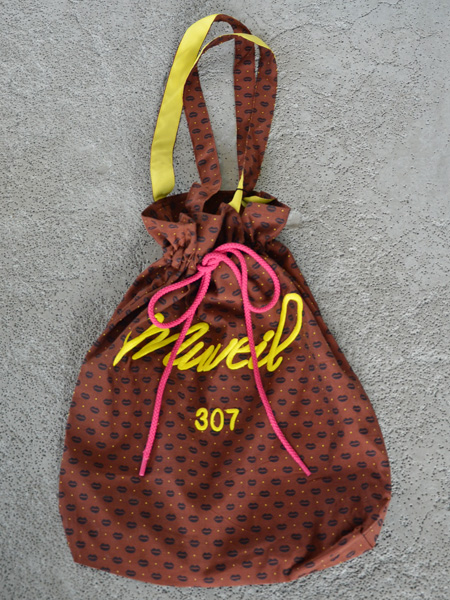 ピンクのヒモを引っ張ると巾着型に変形することができます。