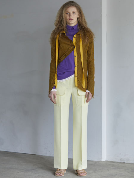 カラー展開はこちらのLOOKで使用されているパープルと、2枚目で着用しているマスタードの2色。