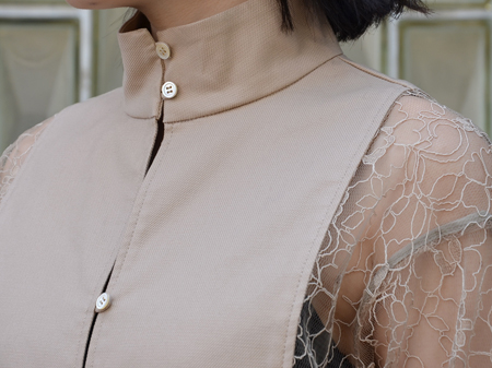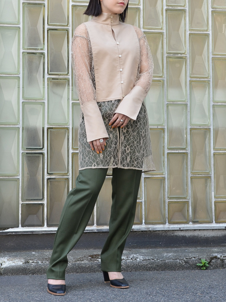 スタンドカラーのレースシャツ。