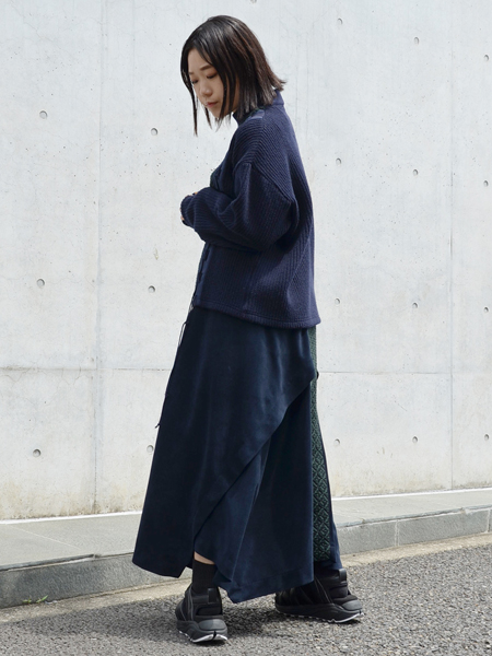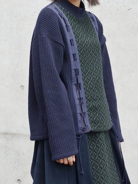 ニットは編み地の切り替えやサイドのコードレースアップ、