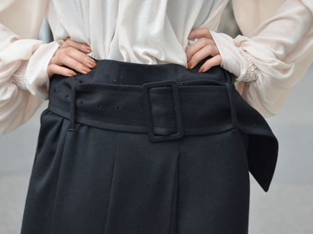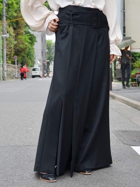 ウール生地をたっぷり使用したワイドパンツは片足だけ深めのスリットが。